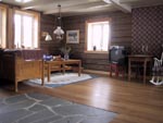 golv av massiv eikplank. I salongen er det en gammel TV for å få